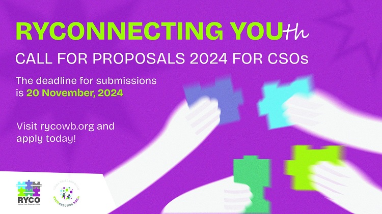 Обавјештавамо вас да је објављен Јавни позив RYCOnnecting You(th) за подношење пројектних приједлога за невладине организације који финансира Регионална канцеларија за сарадњу младих (RYCO). Позив је отворен за подношење пројектних приједлога до 20. новембра 2024. године. Општи циљ Позива је да подржи цивилно друштво на Западном Балкану, те да његује помирење, регионалну сарадњу и интеркултурално учење кроз пружање могућности младима које би створиле простор за дијалог, међусобно учење и веће разумијевање широм региона. Овај позив финансира сљедеће Тематске области: